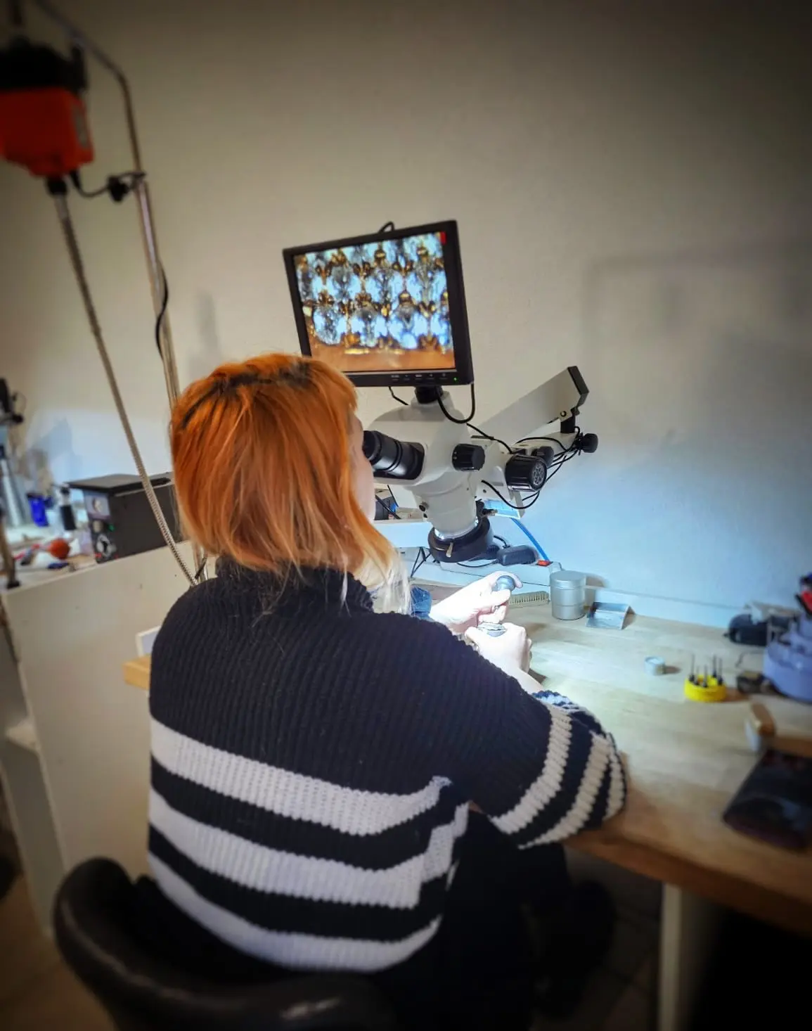 Dans un cadre à taille humaine — 4 stagiaires maximum par session — les apprentis découvrent les techniques du sertissage professionnel et de la joaillerie traditionnelle, tout en développant leur autonomie et leur sens du détail.